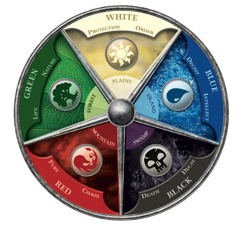Now a pentagram is a sacred symbol to many because you can draw it in one stroke. It's points and lines seem to provide a satisfying model for several systems of competing goals. Magic the gathering uses it to explain the source of conflicts and confluences in their spell system: